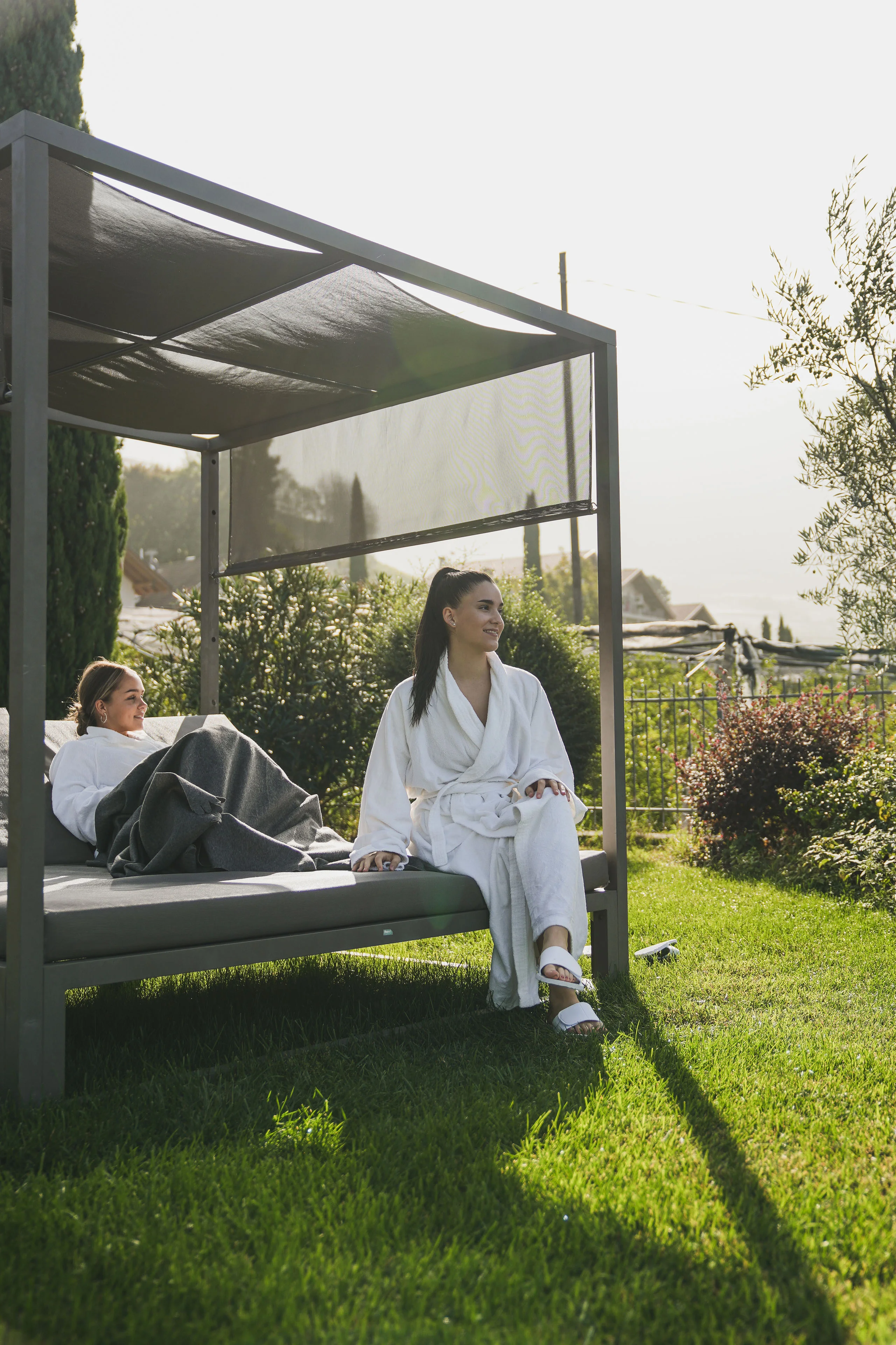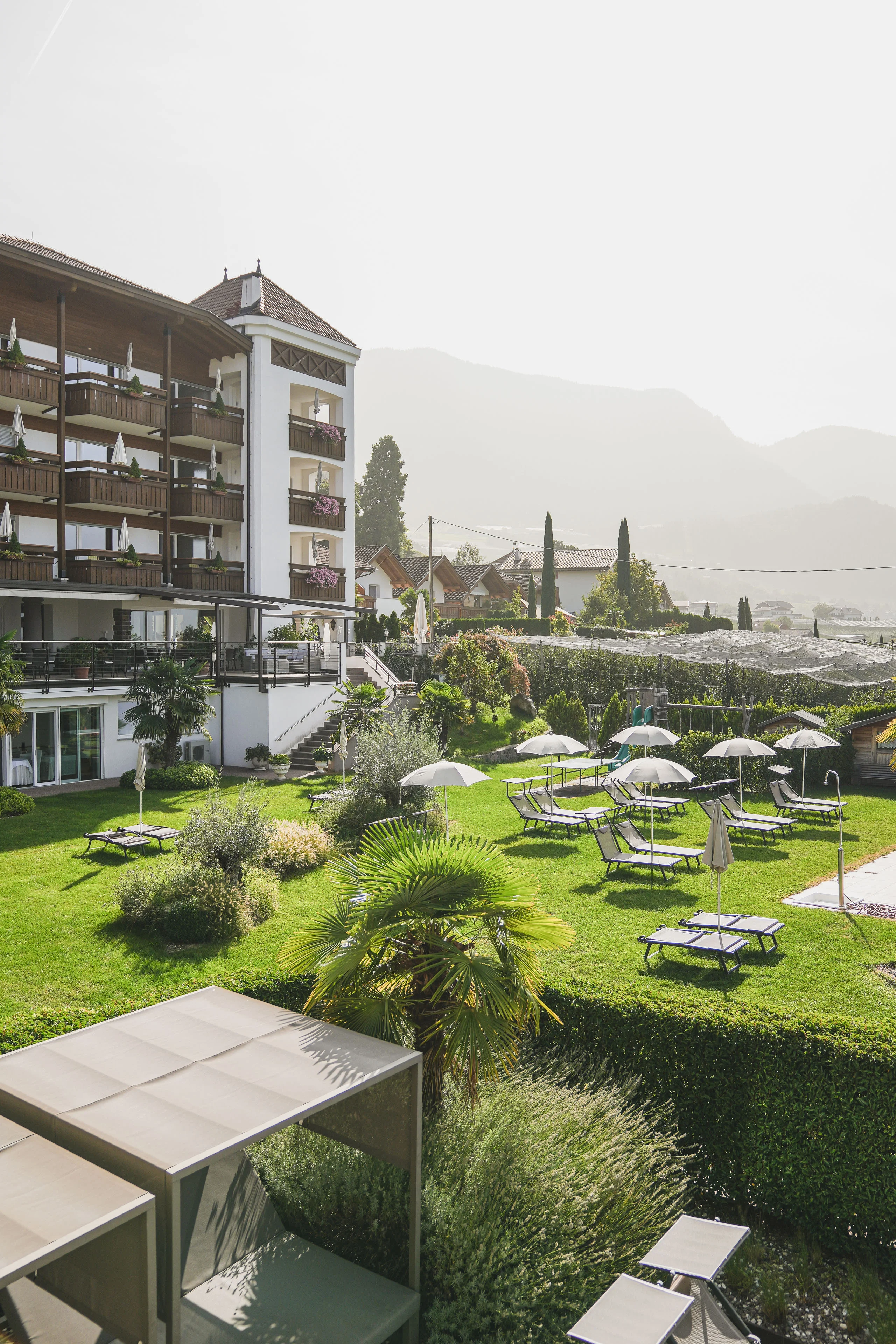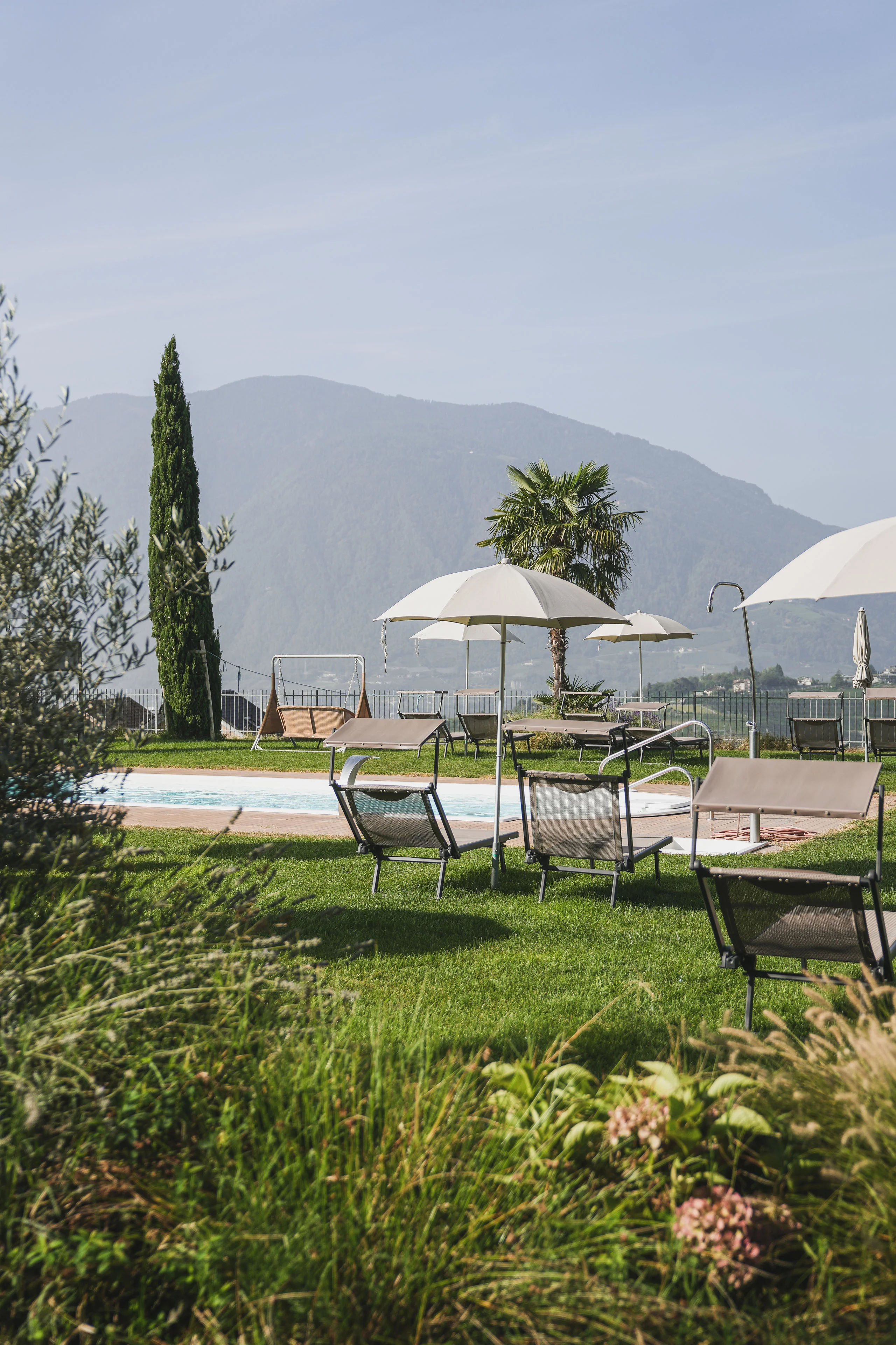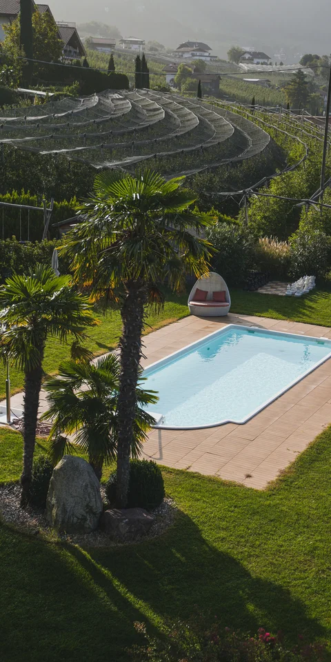 Der angenehme Schatten mediterraner Palmen und Olivenbäume, das alpine Panoramakino der Texelgruppe: Wetten, dass der großzügige Panoramagarten bereits von eurer Ankunft an zu euren Lieblingsplätzen in unserem Hotel mit Pool in Schenna zählt? Ein Ort zum süßen Nichtstun. Zum Sonnenanbeten, Aussicht-Genießen oder für ein herrliches Nickerchen. Und wenn ihr es noch ruhiger mögt, zieht ihr euch in die lauschige Outdoor-Spa-Lounge nebenan zurück und lasst die Welt mal sich alleine weiterdrehen.