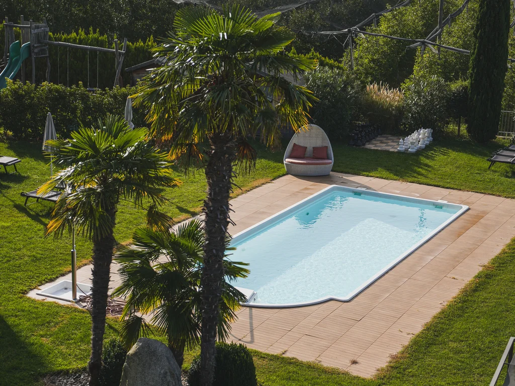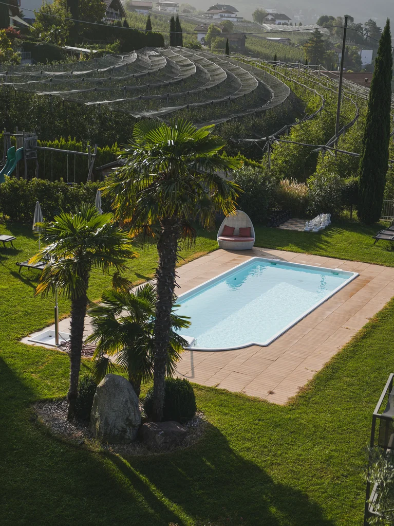 Euer Wohlfühlort für heute auf dem satten Grün im Garten ist gefunden. Ihr lest das grandiose neue Werk eures Lieblingsautors, versinkt ins Lösen kniffliger Rätsel oder lasst einfach nur den Blick über die herrliche Bergkulisse schweifen. Und irgendwann ist euch von Sonne pur so heiß, dass ihr euch in den Outdoorpool mit integriertem Whirlpool gleiten lasst und ein paar kräftige Schwimmzüge macht. Geborgenheit findet ihr anschließend im Infinity-Whirlpool auf der Dachterrasse – und bekommt feinstes Bergkino gleich mit dazu. Genauso wohlig: der beheizte Panorama-Indoorpool eures Hotels mit Hallenbad bei Meran, den ihr in nur wenigen Schritten direkt von der Liegewiese erreicht. Ein besonderes Highlight haben wir noch für euch: Alle unsere Schwimmbäder sind Salzwasserpools und kommen daher mit sehr wenig Chlor aus.