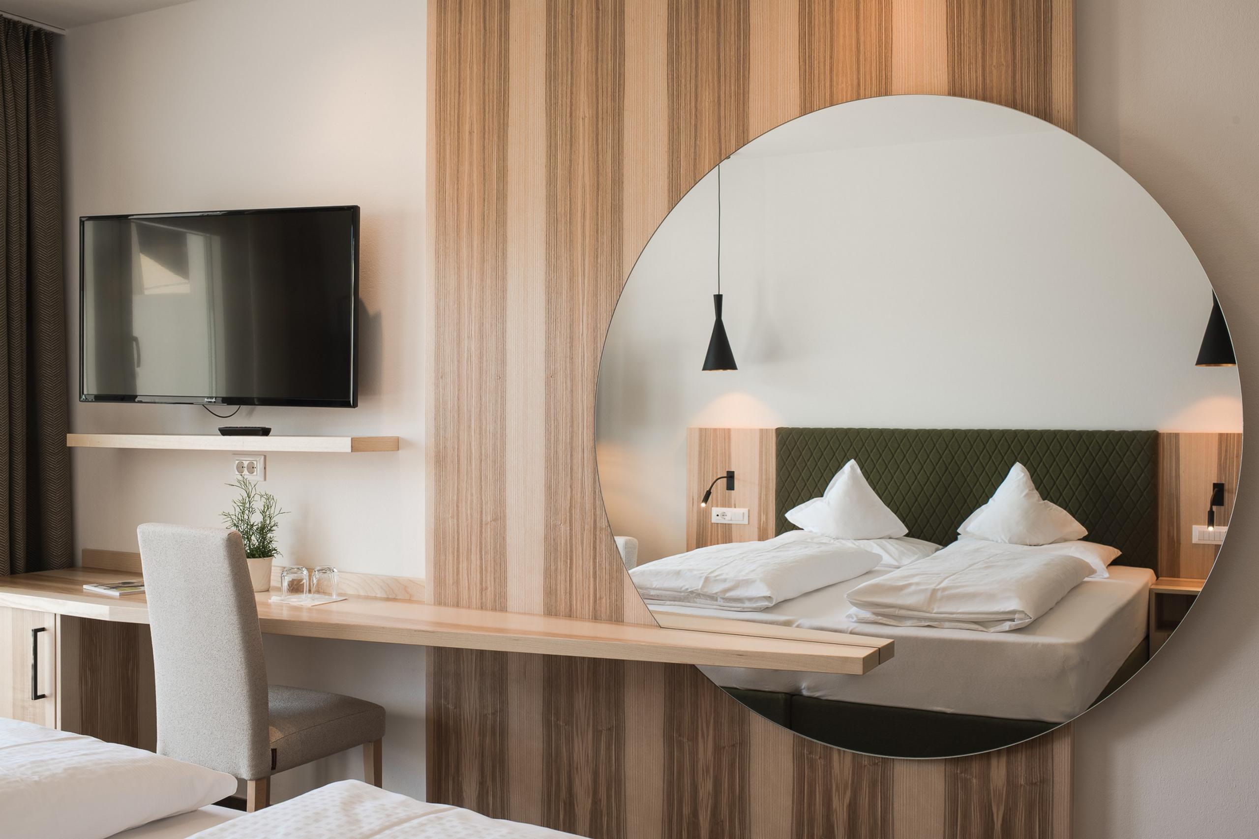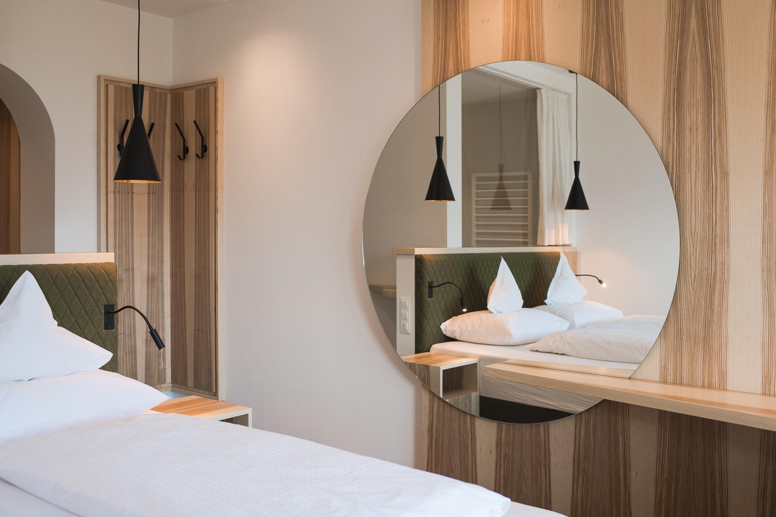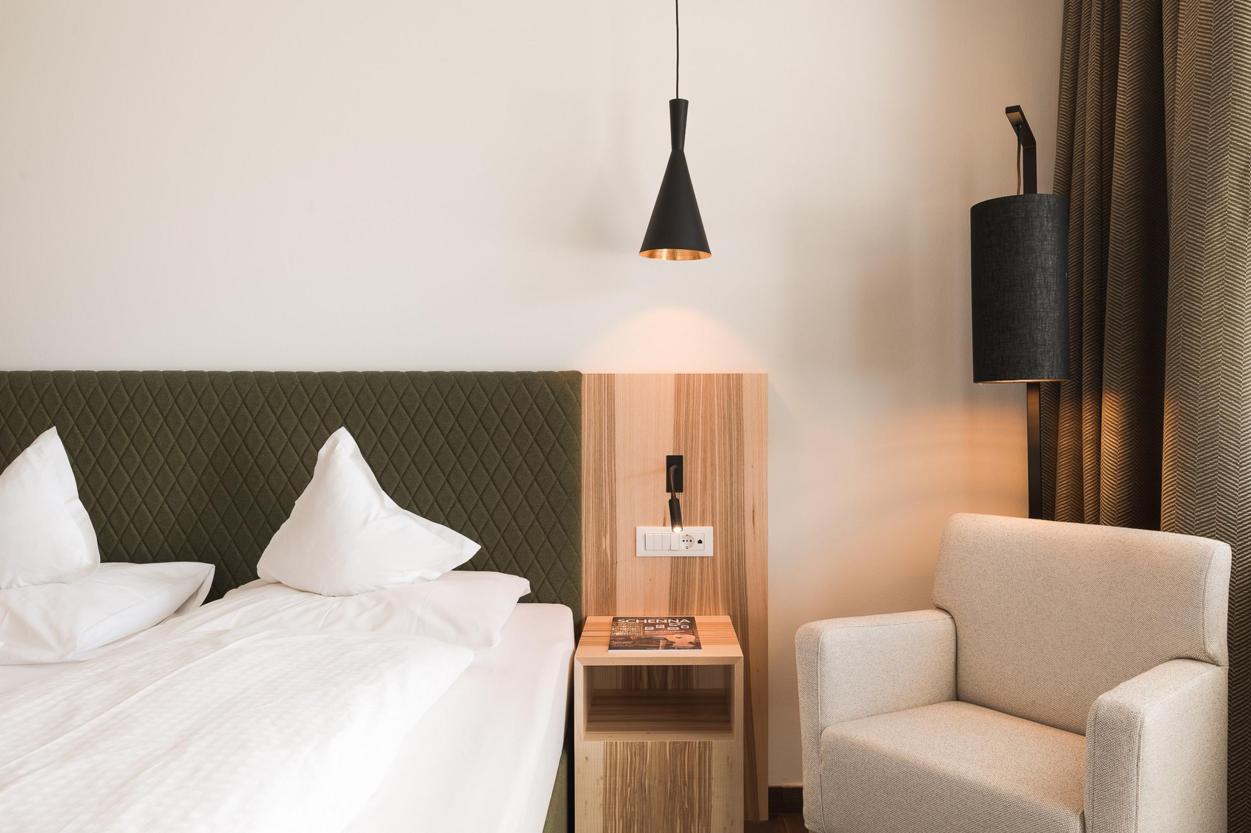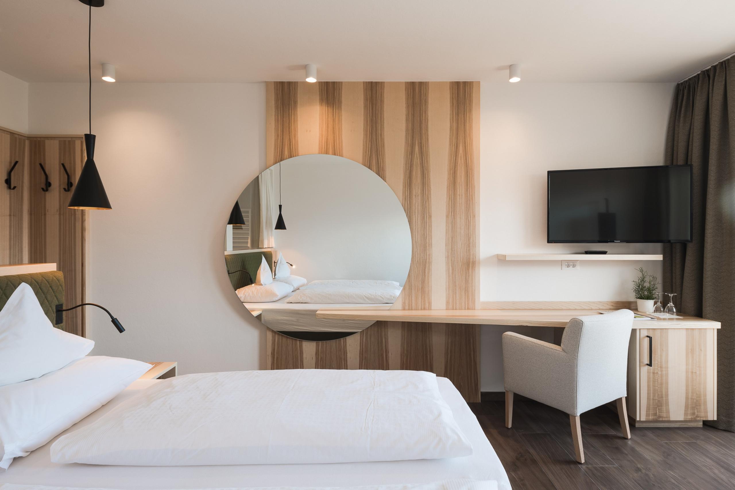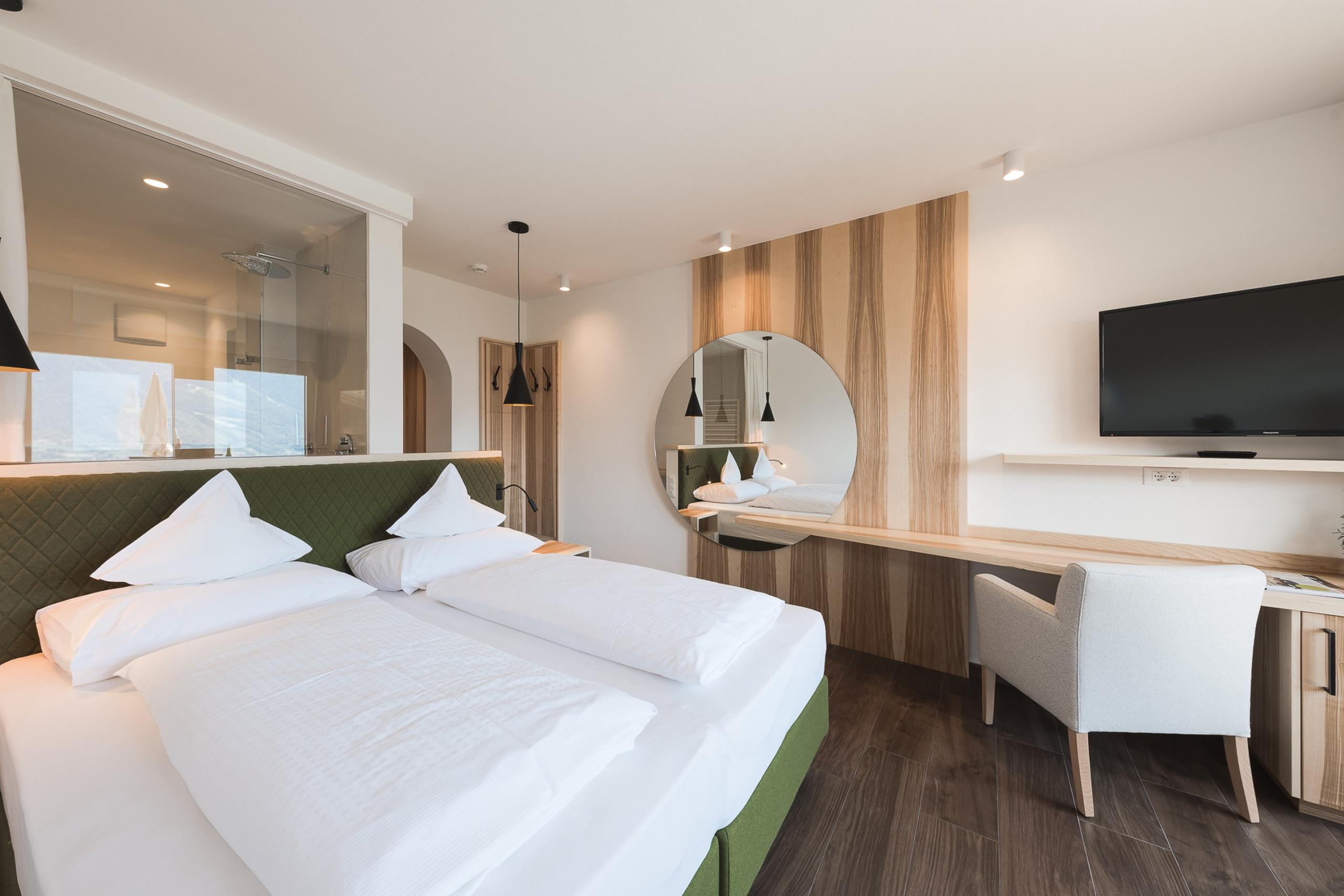 Wer hier eintritt, tritt gewissermaßen ein in ein Stück Südtiroler Natur: Das Doppelzimmer erinnert an blühende Wiesen, grüne Hügel und den Duft frisch gemähter Kräuter, der durchs Tal zieht. Es ist geradlinig, modern und mit feinem Gespür für Geborgenheit gestaltet – natürlich und reduziert, aber nie rustikal und kühl.