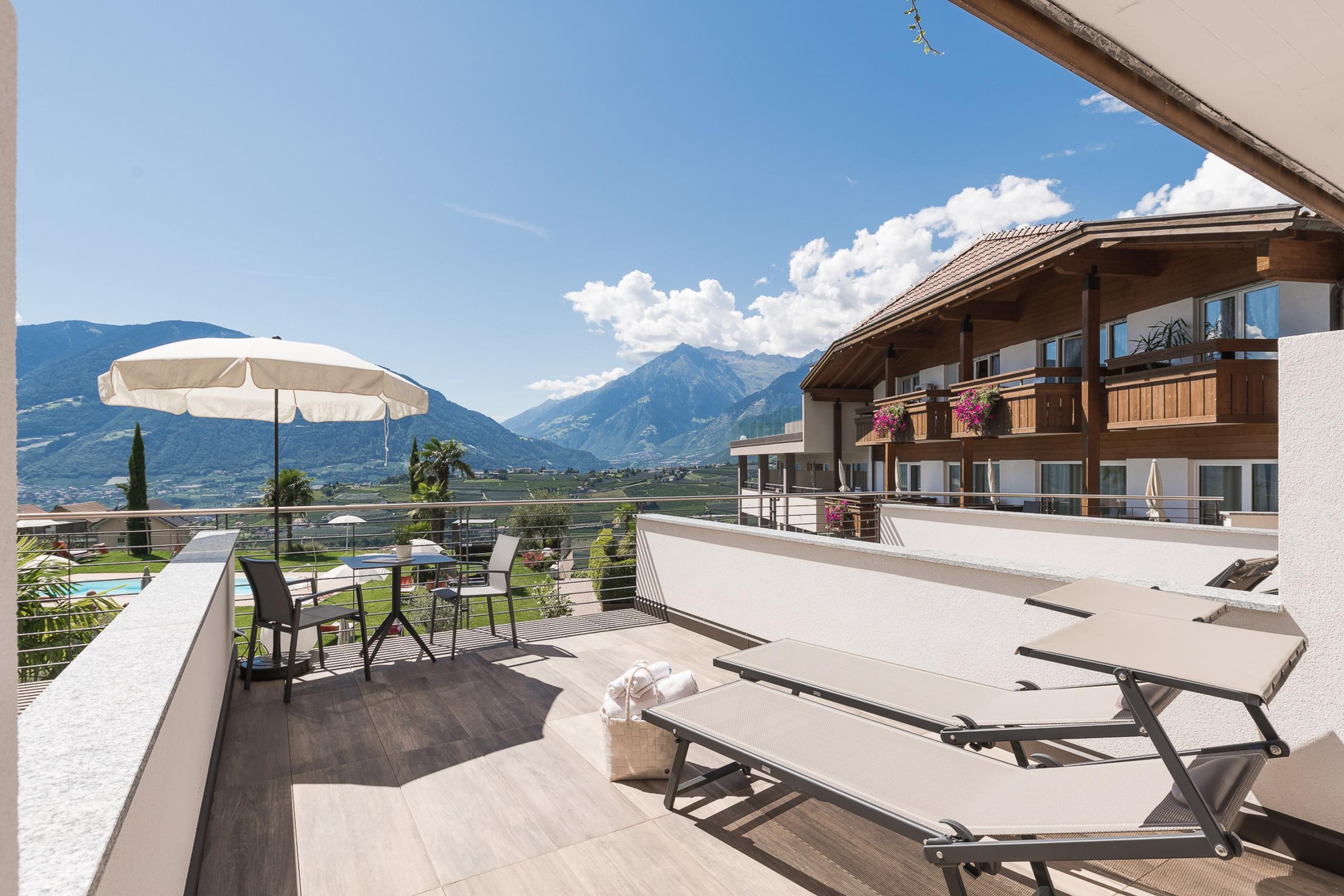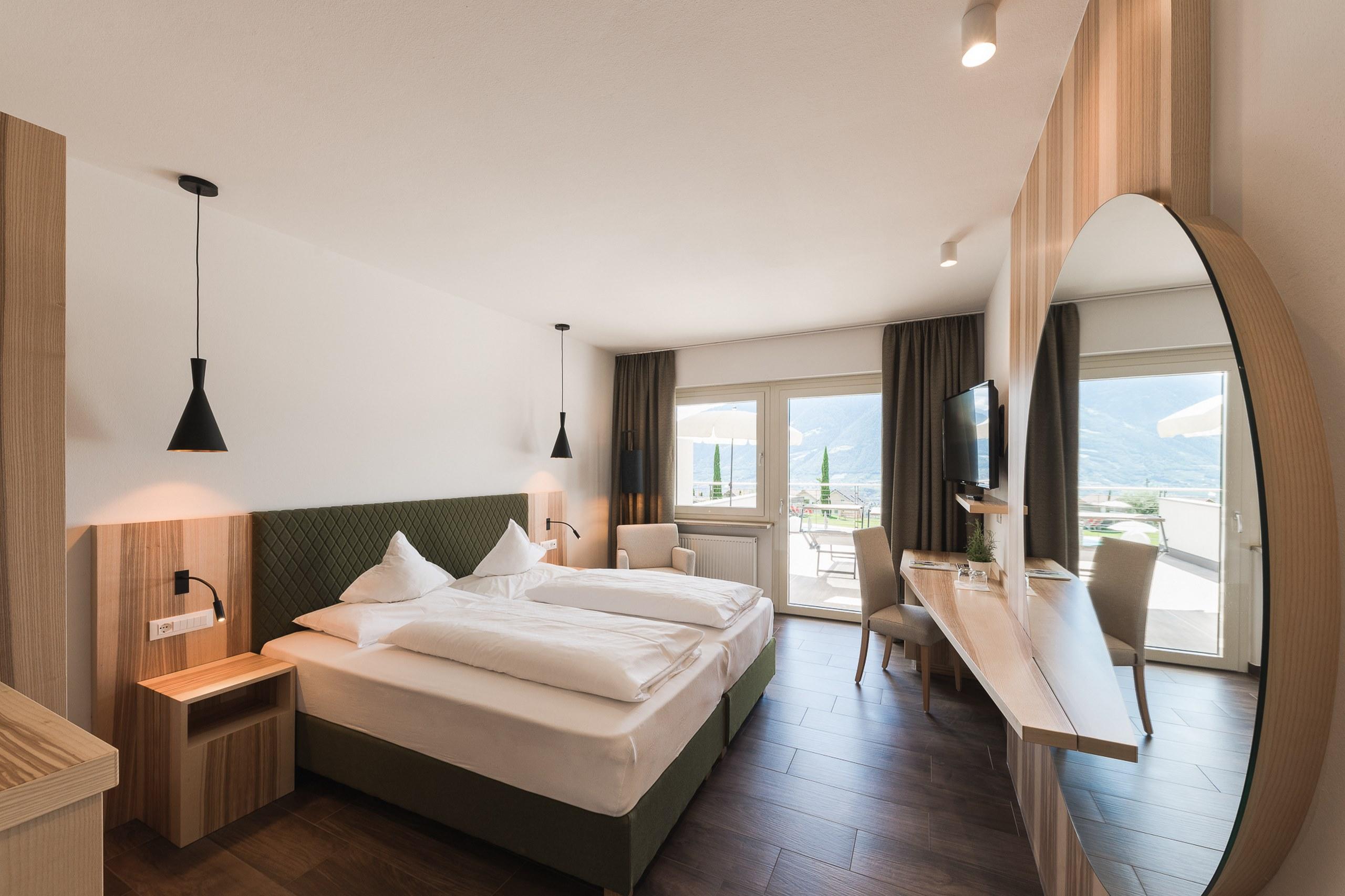 Ein Raum, inspiriert von Südtirols Wiesen und Hügeln – mit Boxspringbett, Panoramabad und Balkon oder Terrasse ins Grüne.