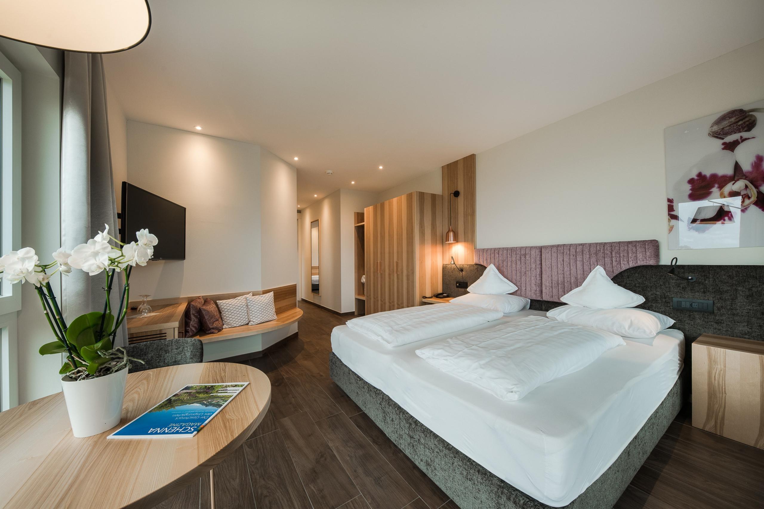 Die Familiensuite Orchidee ist wie gemacht für alle, die gemeinsam reisen und dennoch individuelle Rückzugsräume schätzen. 2 getrennte Schlafbereiche sorgen für Privatsphäre, ohne das harmonische Gemeinschaftsgefühl zu verlieren. Die Suite ist dabei stilvoll und klar im Design: warme Holzböden, ein komfortables Boxspringbett, hochwertige Naturmaterialien und eine Farbwelt, die Leichtigkeit und Geborgenheit verbindet. Das separate WC bietet zusätzlichen Komfort im Alltag.