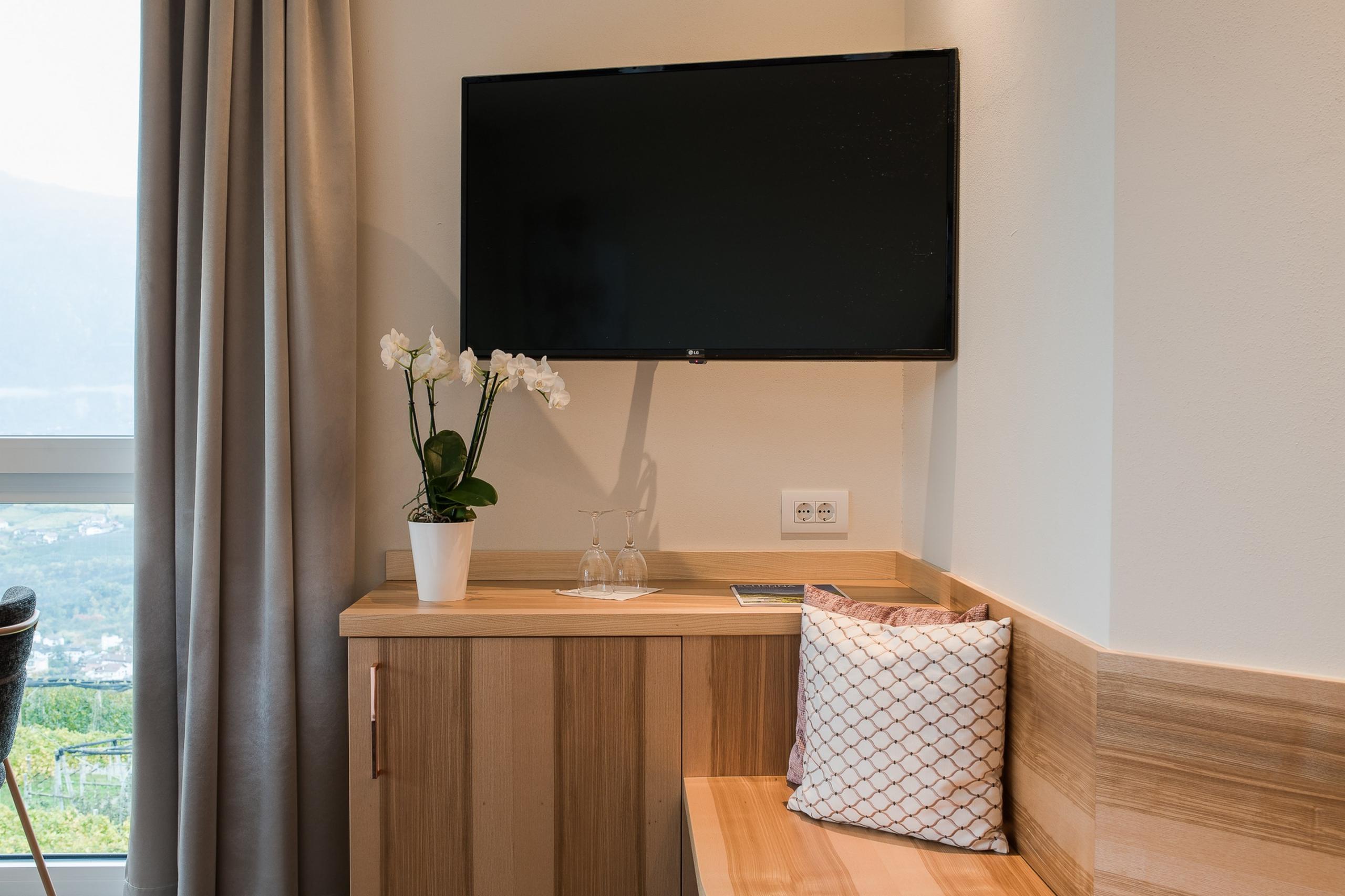Und dann ist da noch die Ecke mit Aussicht: der großzügige Südbalkon, mit Blick weit über Meran und die umliegende Bergwelt. Sonne, Panorama, Ruhe – alles inklusive.