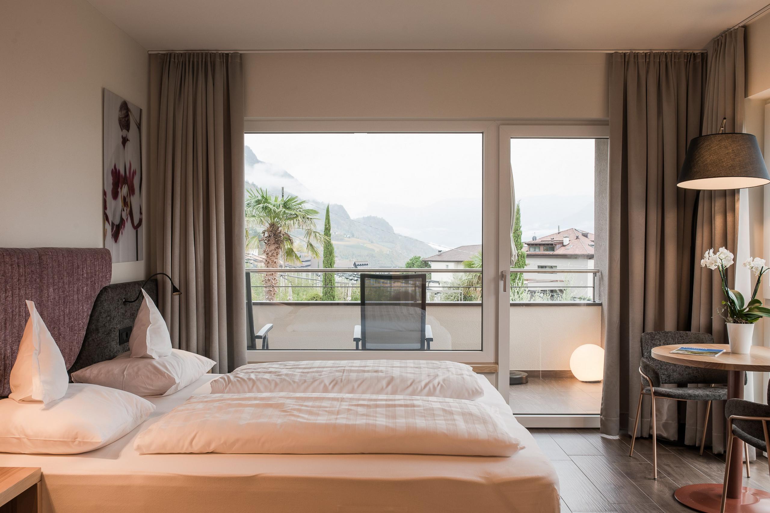 2 separate Schlafräume, stilvolles Design und ein Südbalkon mit Panorama über Meran machen diese Suite zum perfekten Rückzugsort für Familien oder Freundesgruppen.