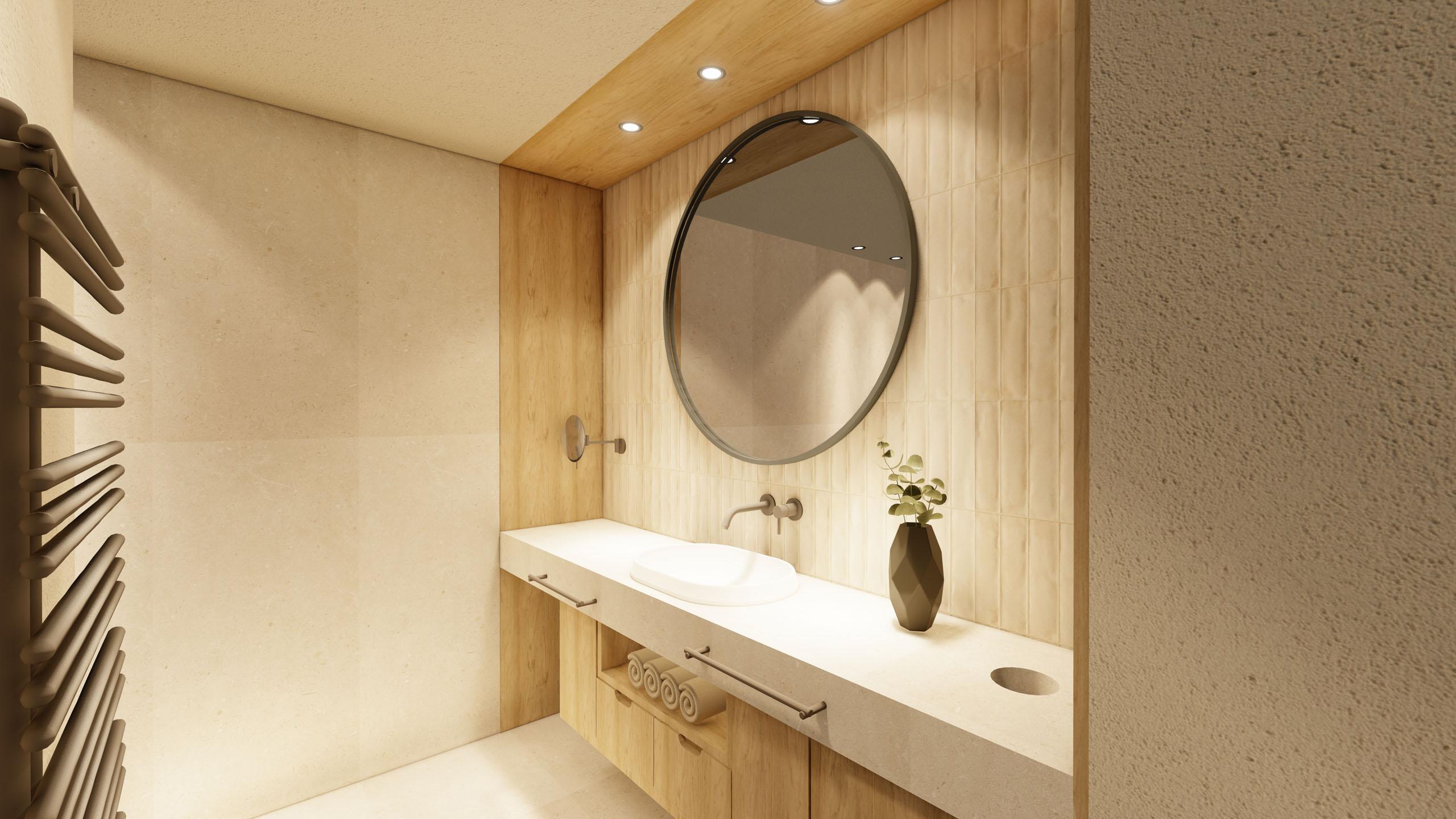 Das elegante Badezimmer bietet reichlich Platz, um sich in Ruhe auf den Tag vorzubereiten oder einfach Momente für sich zu genießen. Ein separates WC sorgt für zusätzlichen Komfort.
