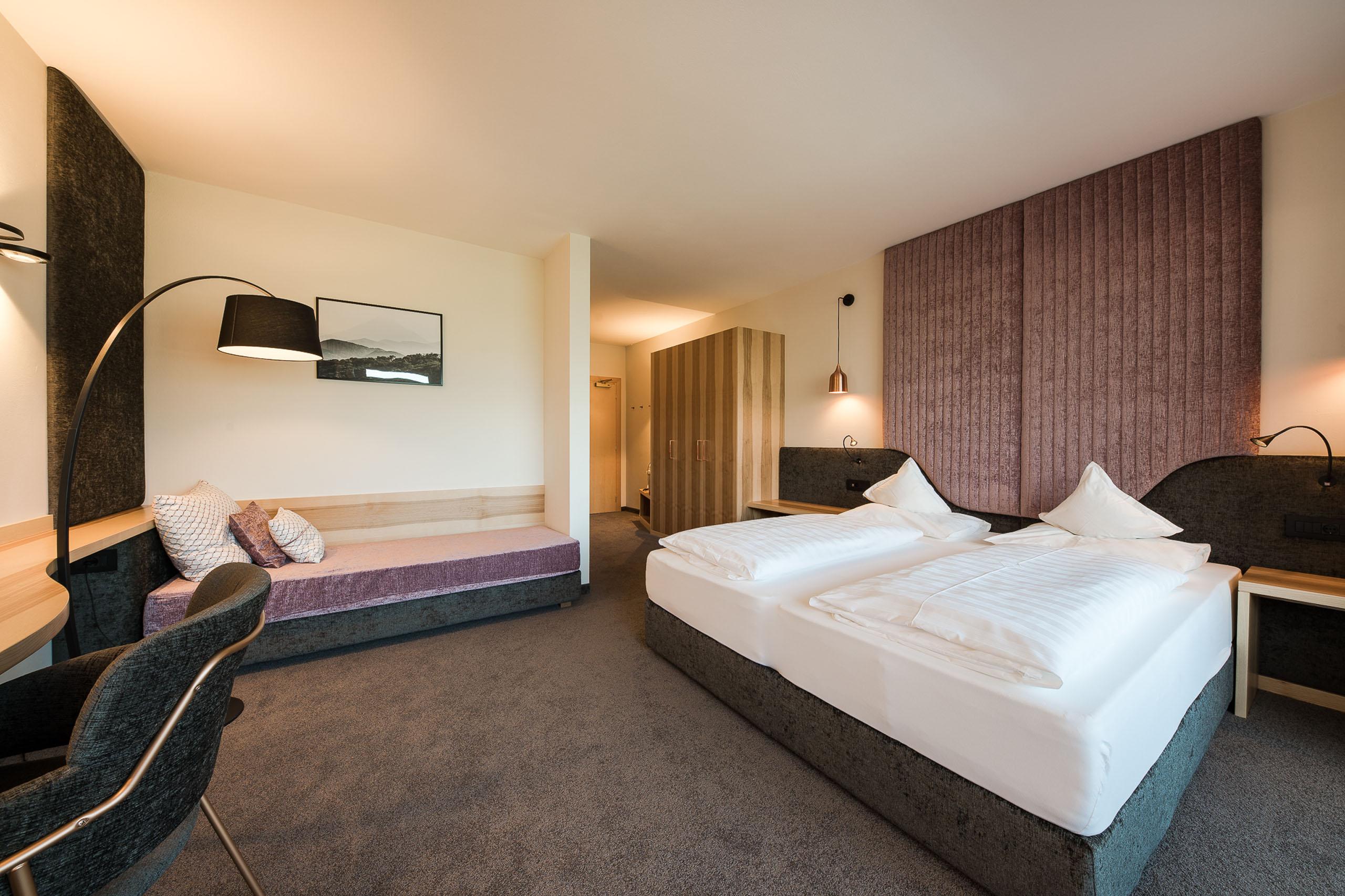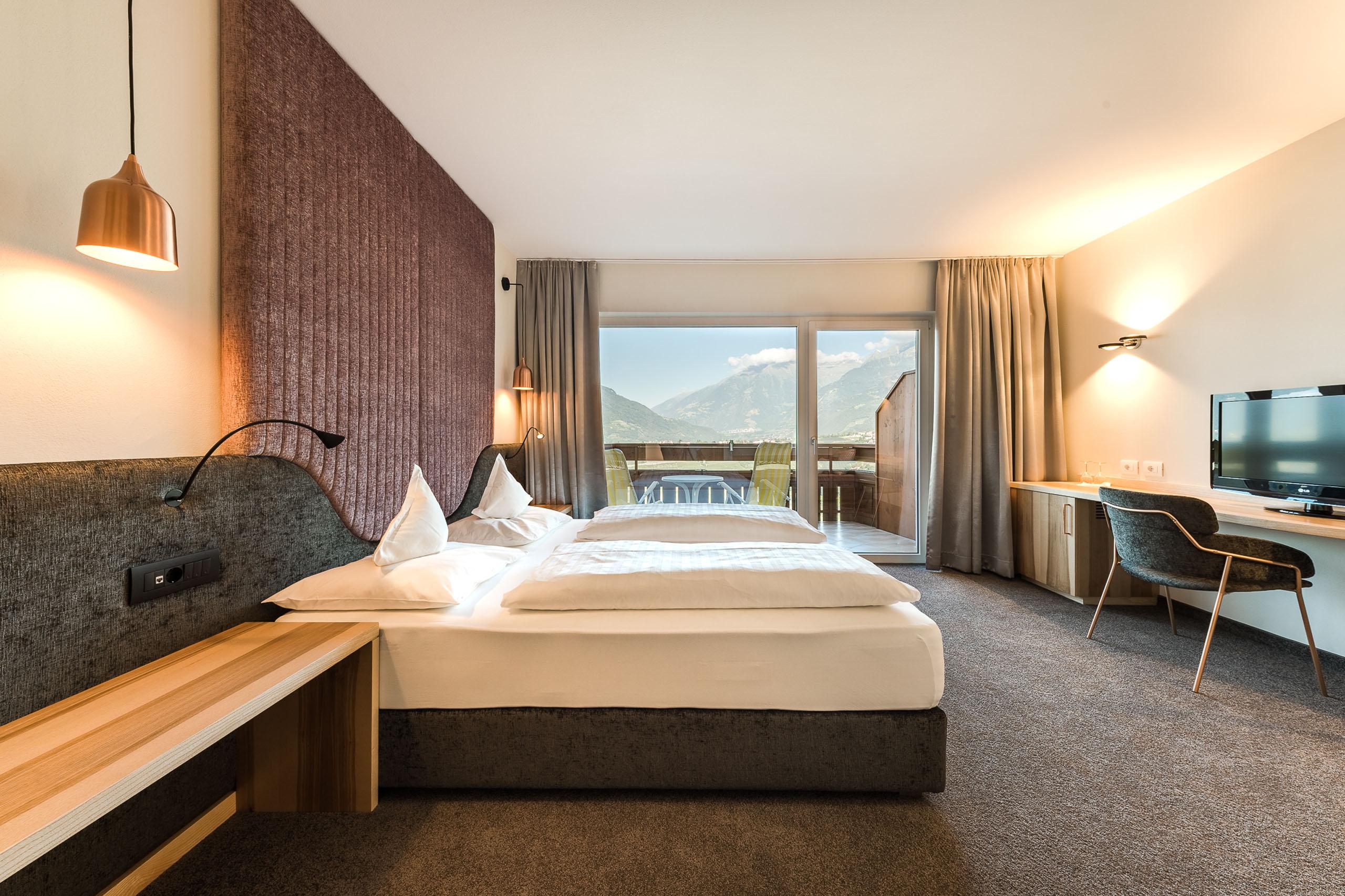 Die Panoramasuite öffnet sich mit großen Fensterflächen hin zum Meraner Becken – und lässt Licht, Landschaft und Weite zur Kulisse werden.