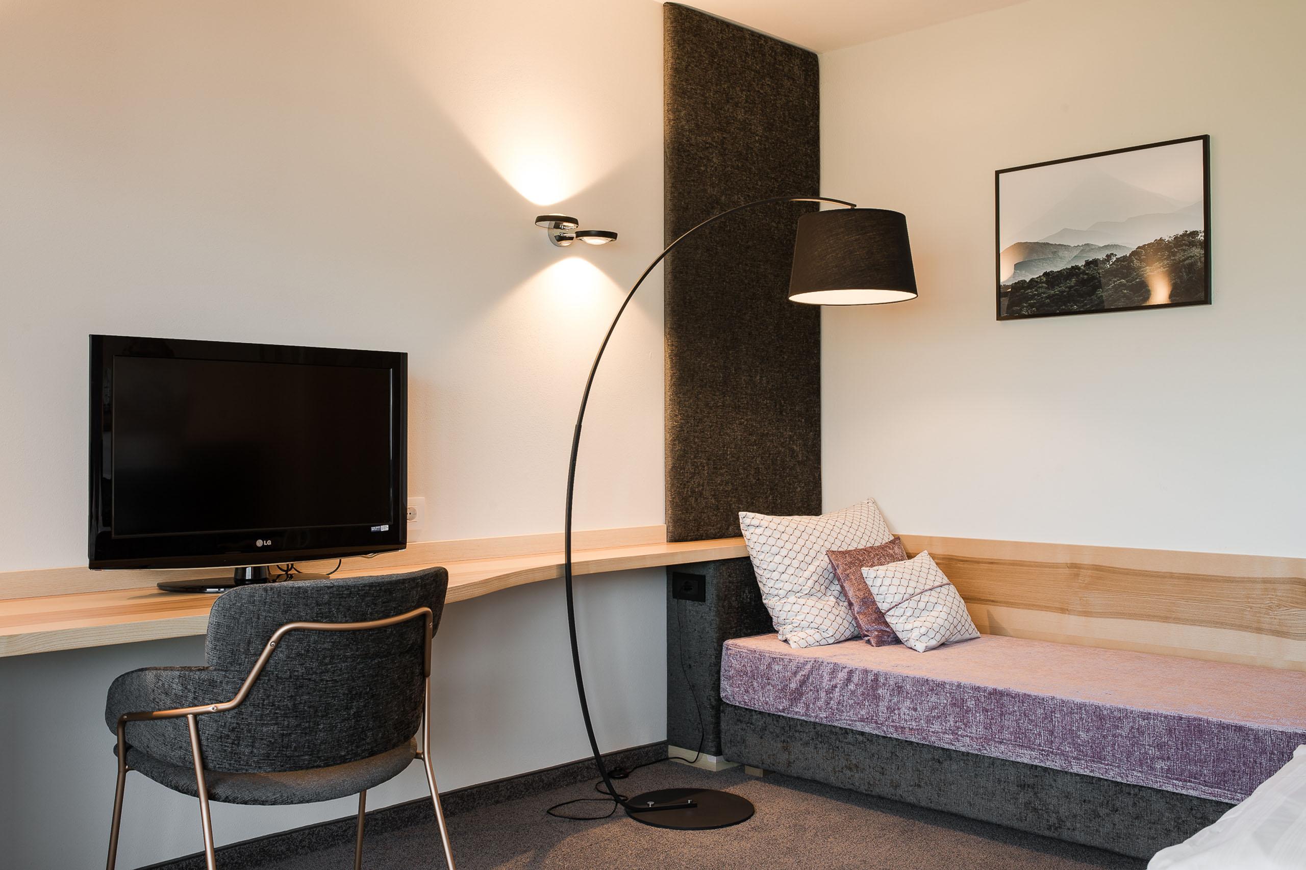 Ein lichtdurchflutetes Refugium mit weichem Teppich, stilvollem Design und einem beeindruckenden Blick über Meran und die umliegende Bergwelt.