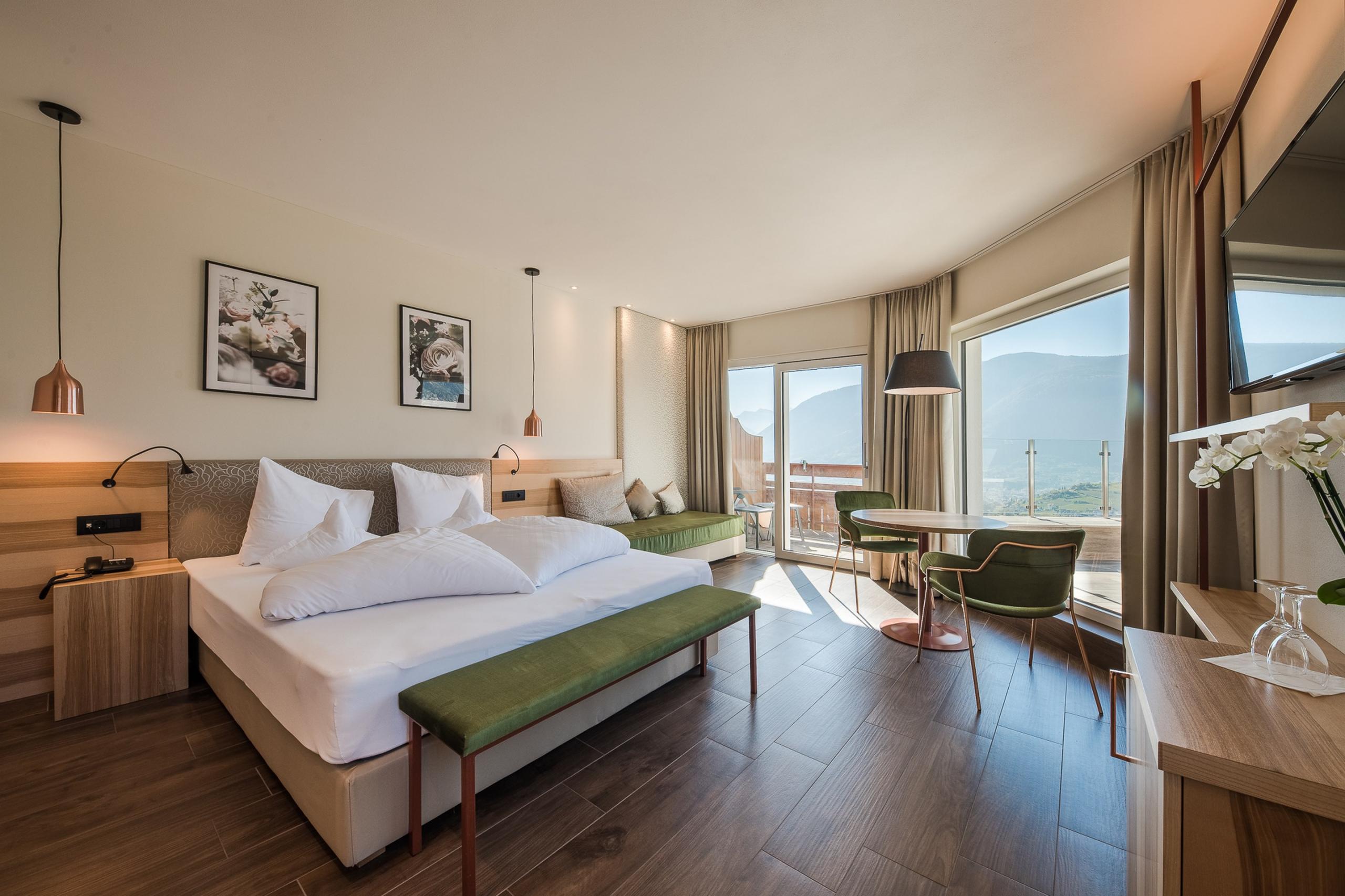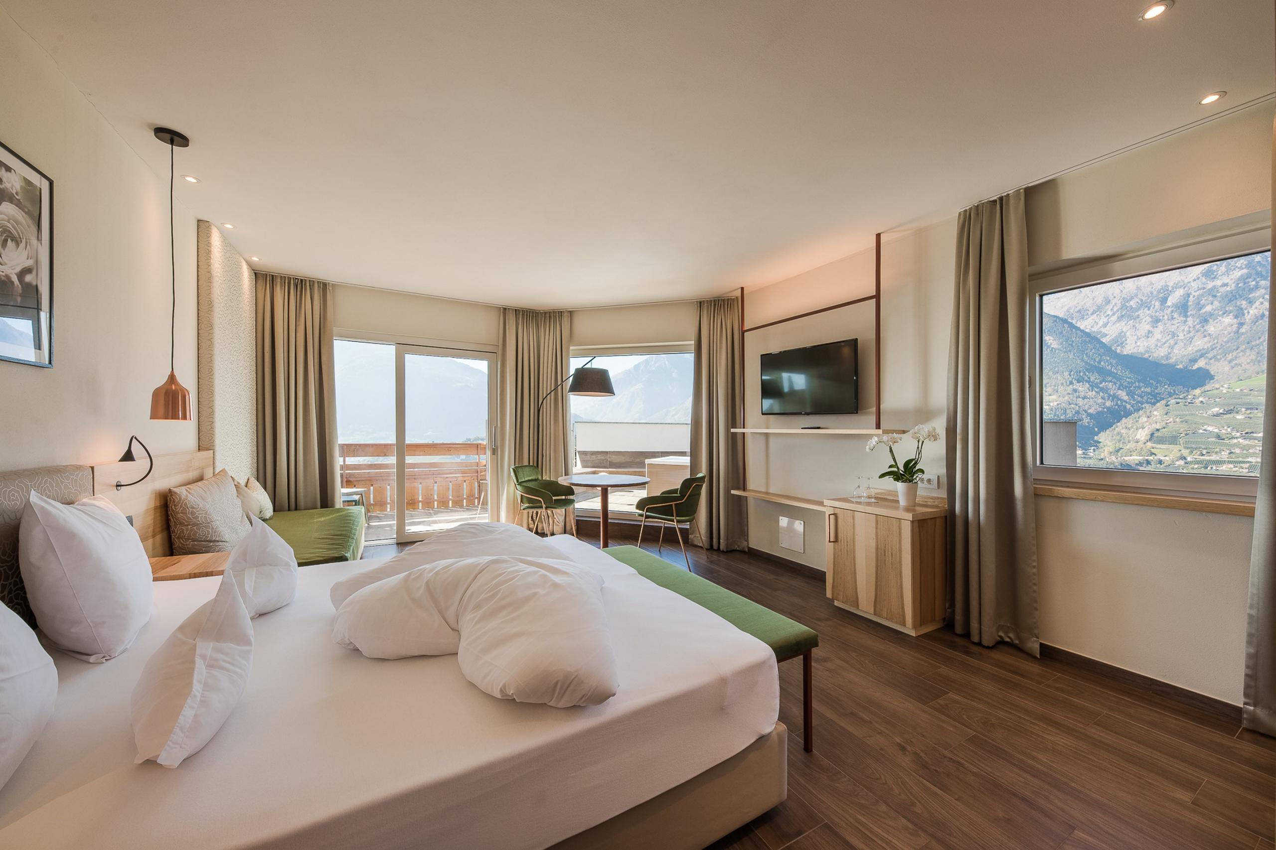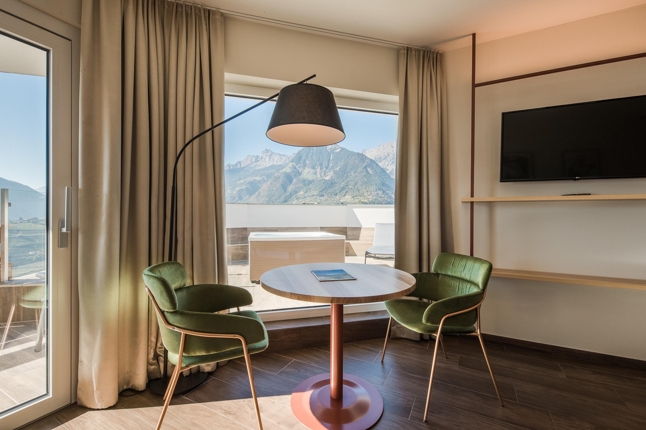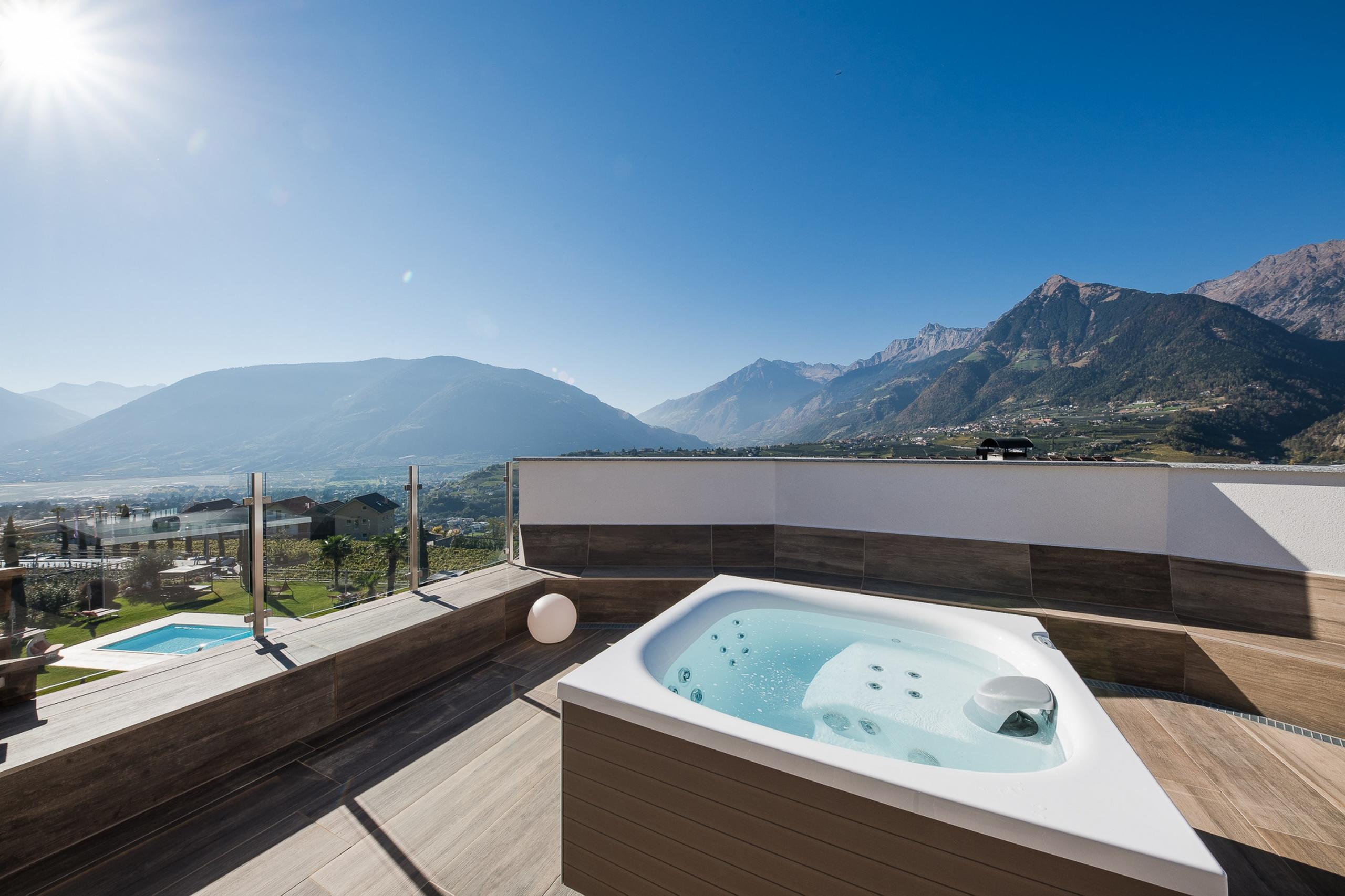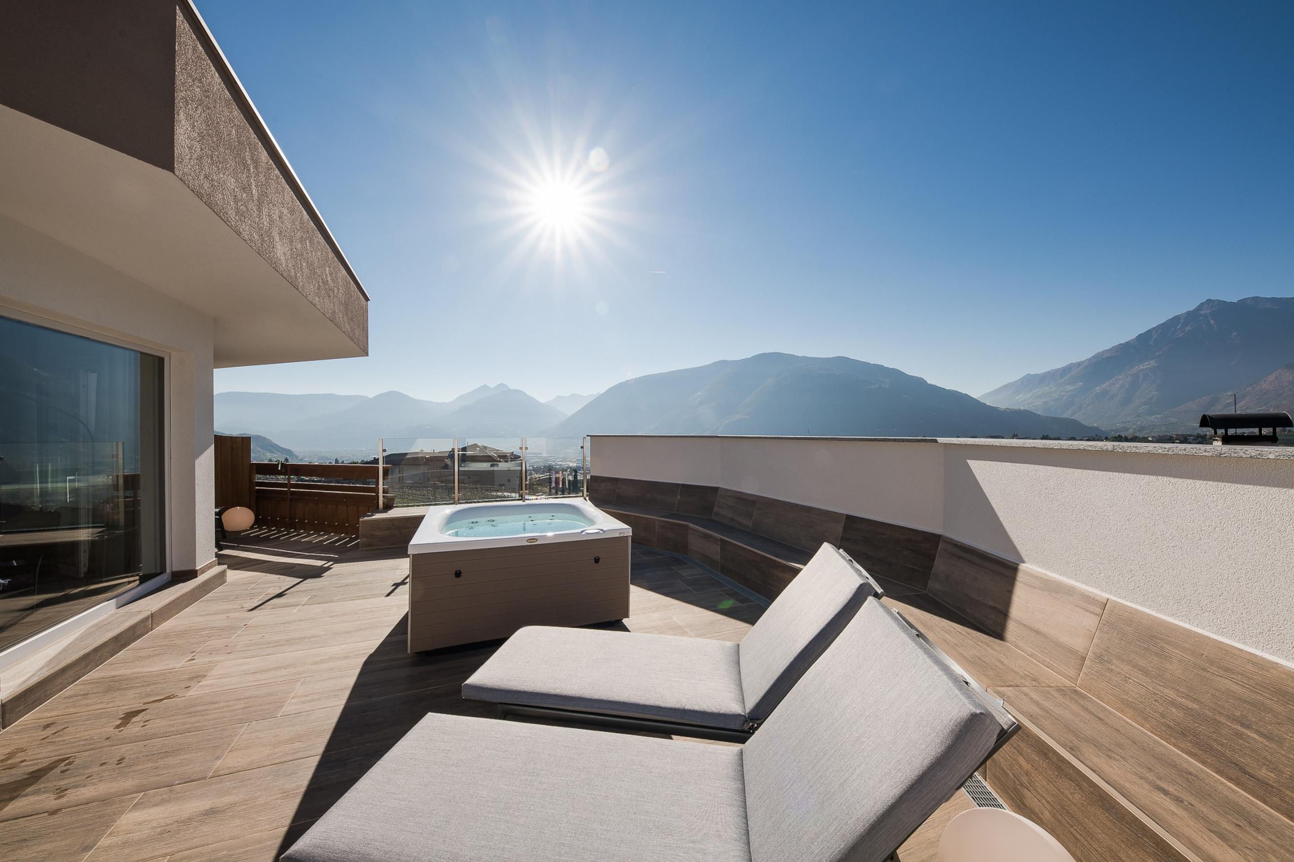 Das wahre Highlight wartet unter freiem Himmel: eure private Dachterrasse mit Whirlpool und 360°-Blick in die Bergwelt. Für romantische Momente. Für Sonnenstunden. Für magische Abende über den Dächern von Schenna.