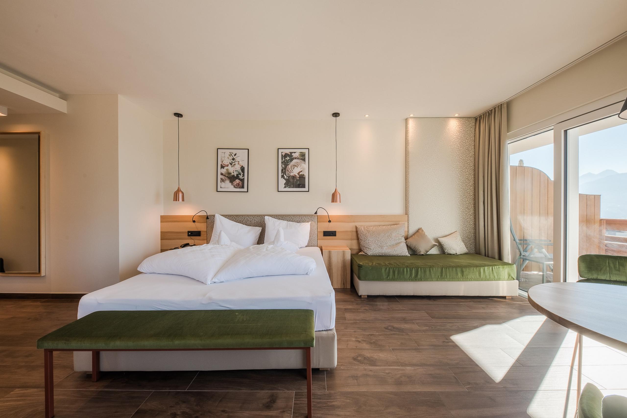 Klare Linien, helle Materialien und eine private Dachterrasse mit Whirlpool und 360°-Ausblick über Südtirols Bergwelt.